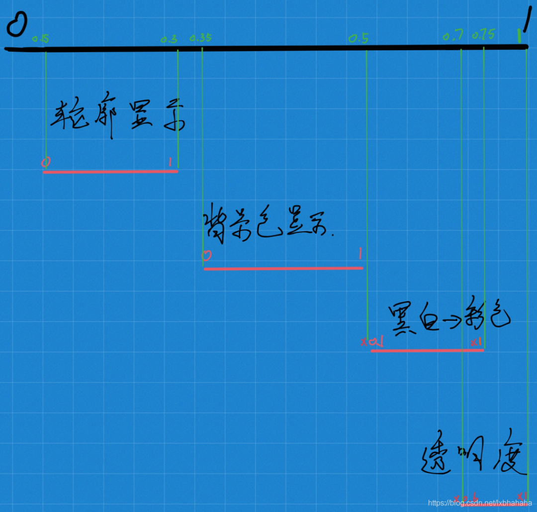 首先需要两张图片,一张是轮廓,一张是颜色。分别容噪声去消融。以及顺便控制图片的颜色和透明度。然后用以0-1的值对应整个流程,通过控制这一个值来控制图片的显示。