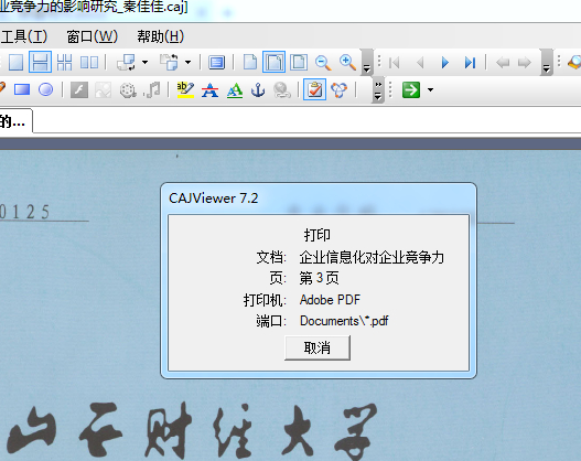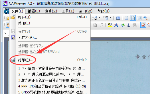 首先,用CAJViewer阅读器打开需要转换的CAJ文件后,使用快捷键Ctrl+P或点击工具栏左上角“文件”选项卡中的“打印”;